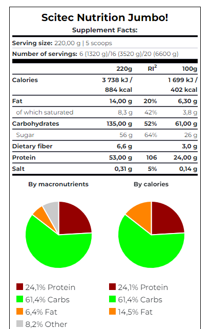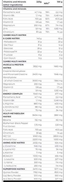 Jumbo – высокоэффективный профессиональный гейнер, содержащий новейший белково-углеводном комплекс. Идеально подходит для всех типов телосложений и не содержит сахара!